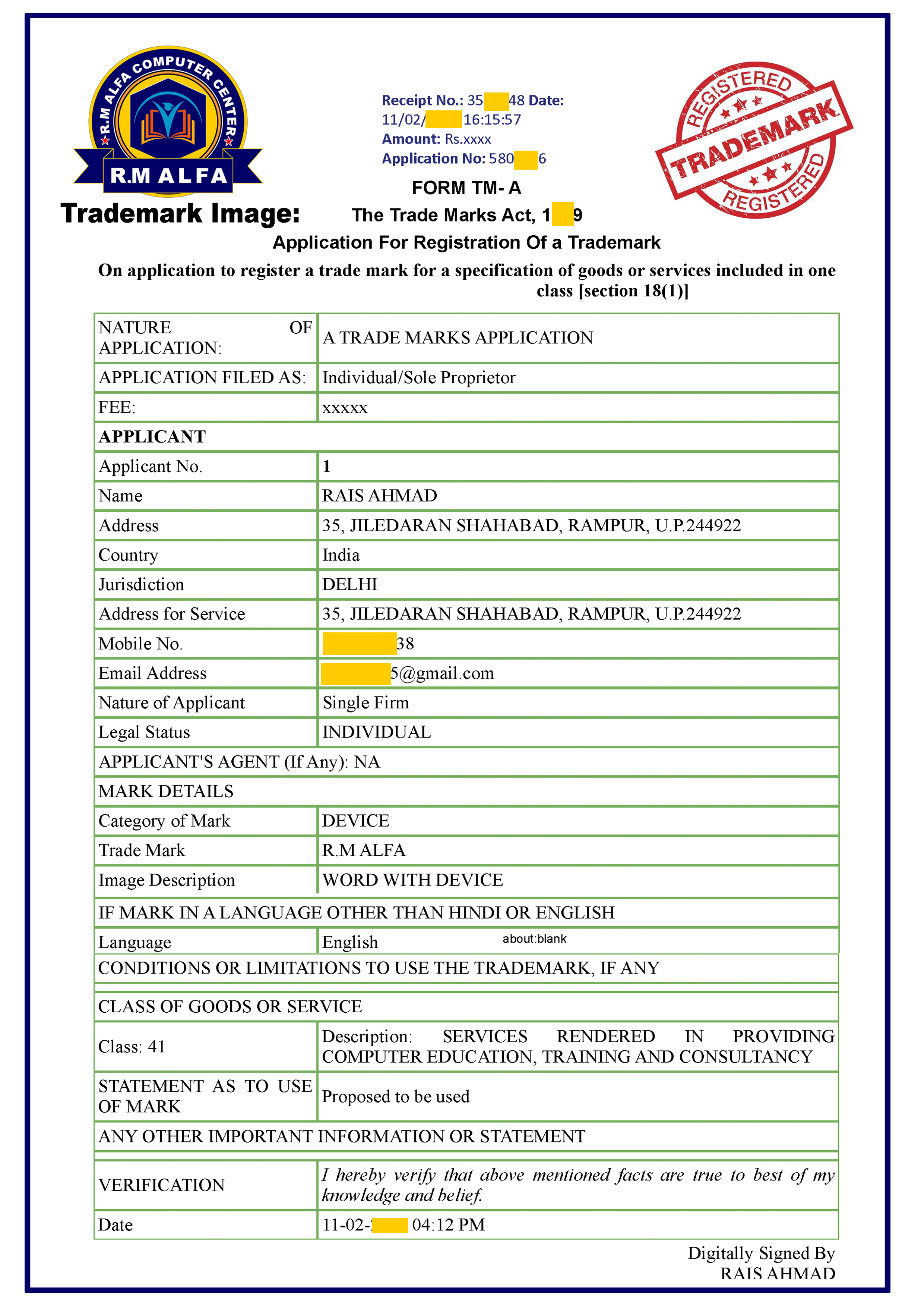 RM ALFA TRADEMARK LOGO Government of India Ministry of Commerce & Industry Department for Promotion of Industry and Internal Trade Controller General of Patents Design & Trade Marks